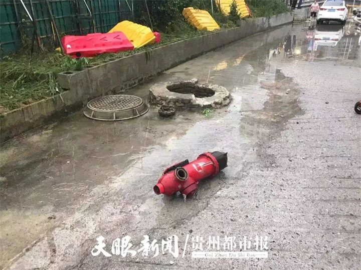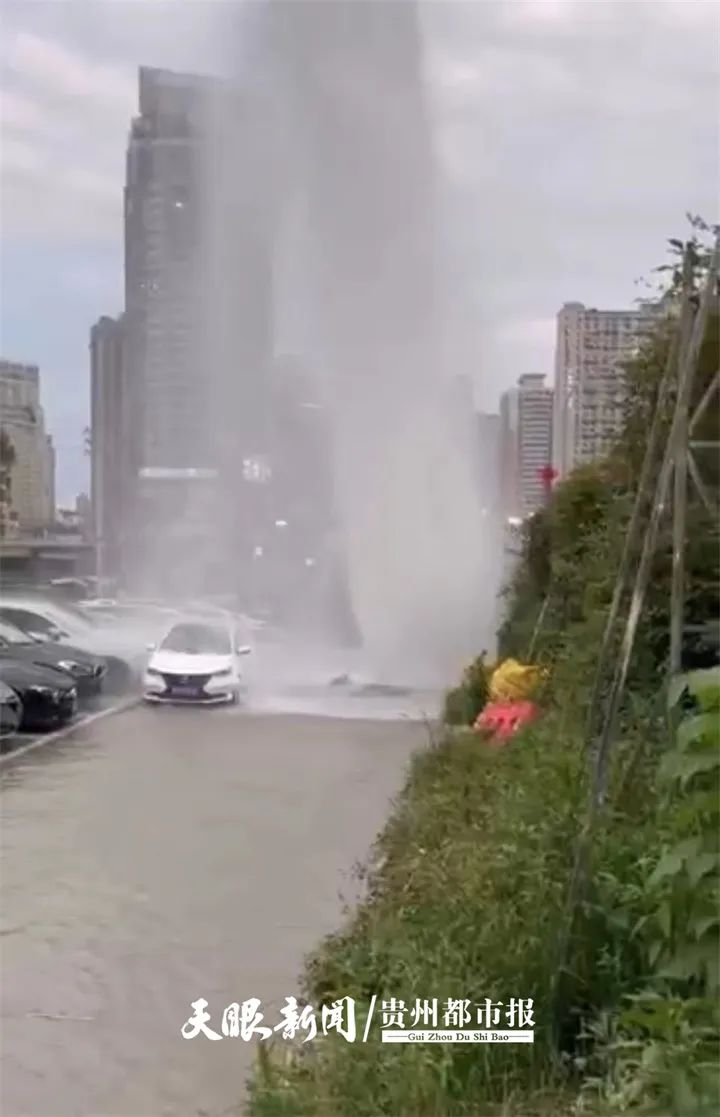 6月14日下午,贵阳市云岩区太平路一停车场内,一消防栓被撞断,粗壮的水柱冲天而起,高约10米。停车场通道地面上已满是积水。伴随着路人的惊呼声,一辆白色轿车准备避开喷涌而出的水柱,没想到倒车中连撞5车。