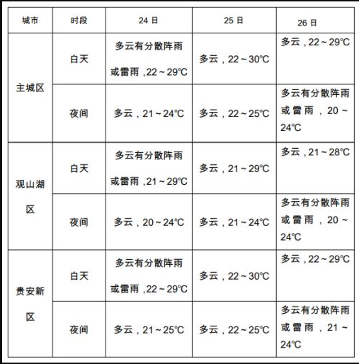 24日夜间到25日白天,多云,有4-6级偏南大风,主城区气温22~29℃;