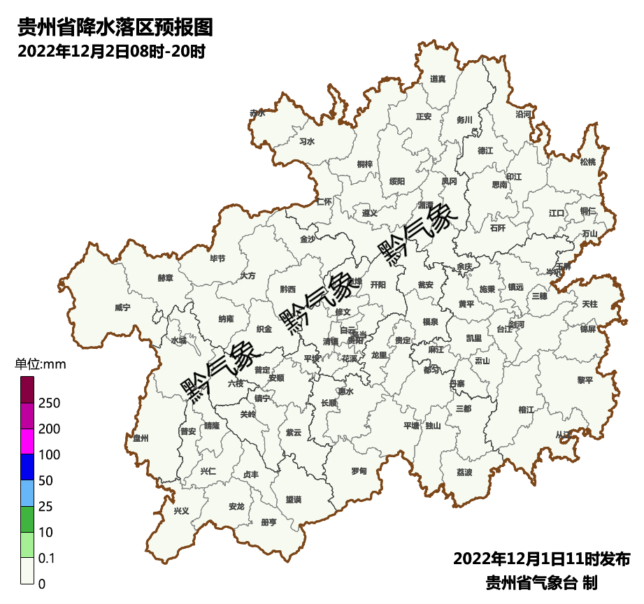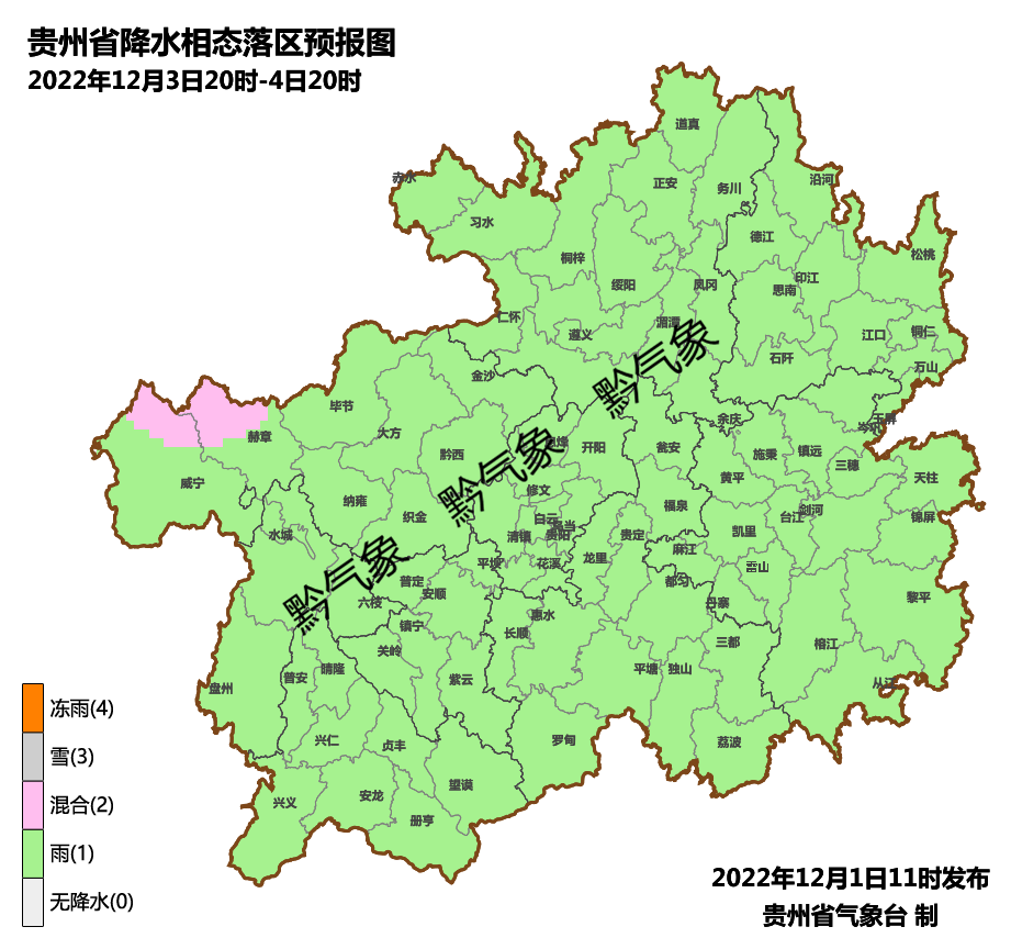今天夜间,铜仁市东部和南部、黔东南州中北部、遵义市南部、黔南州中北部、贵阳市、毕节市大部、安顺市北部有冻雨,东部地势高处有雨夹雪,隧道、桥梁等风口地区及地势高处有道路结冰,省的北部阴天为主,其余地区阴天有小雨,西部地势高处有雾;