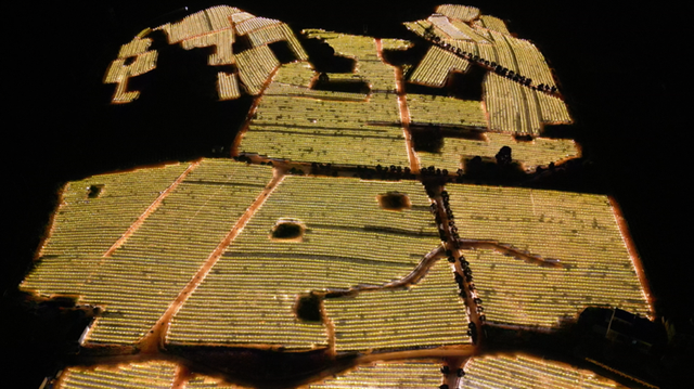 ▲广西火龙果产地夜景。补光后的火龙果产期可提前15天以上,并从每年12批果次增到15批。图|马斌