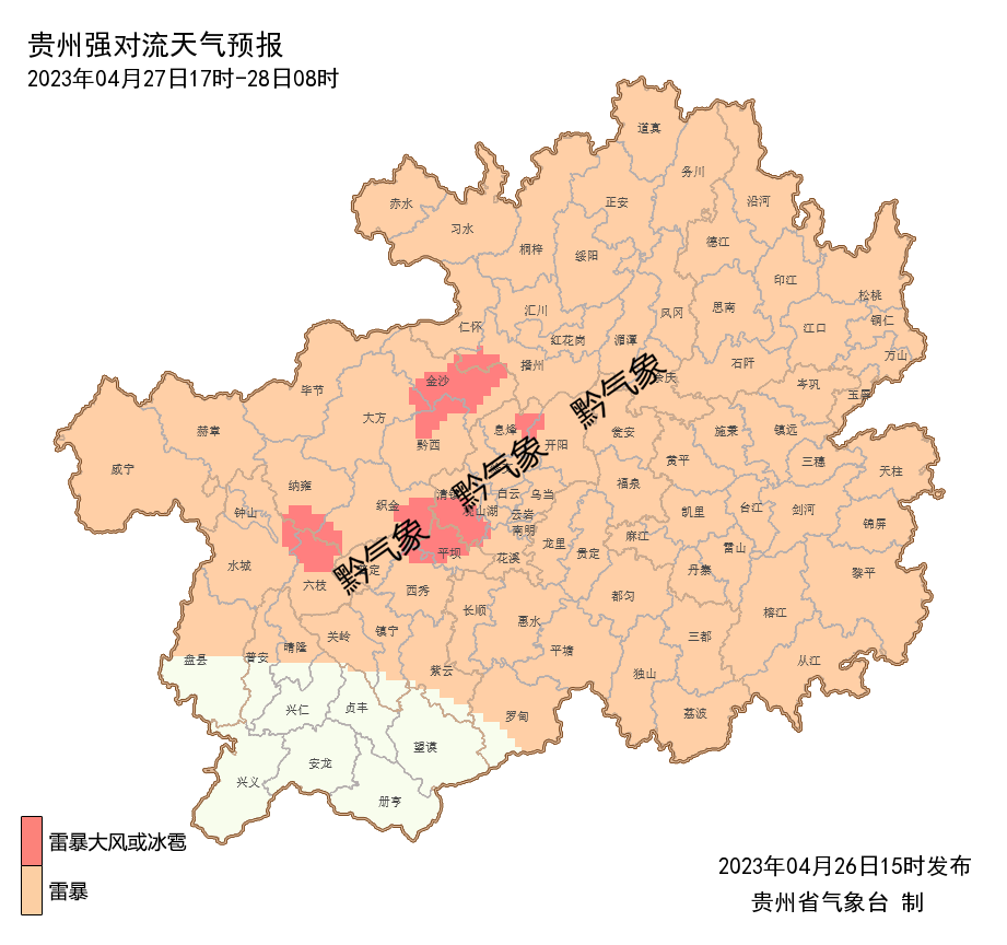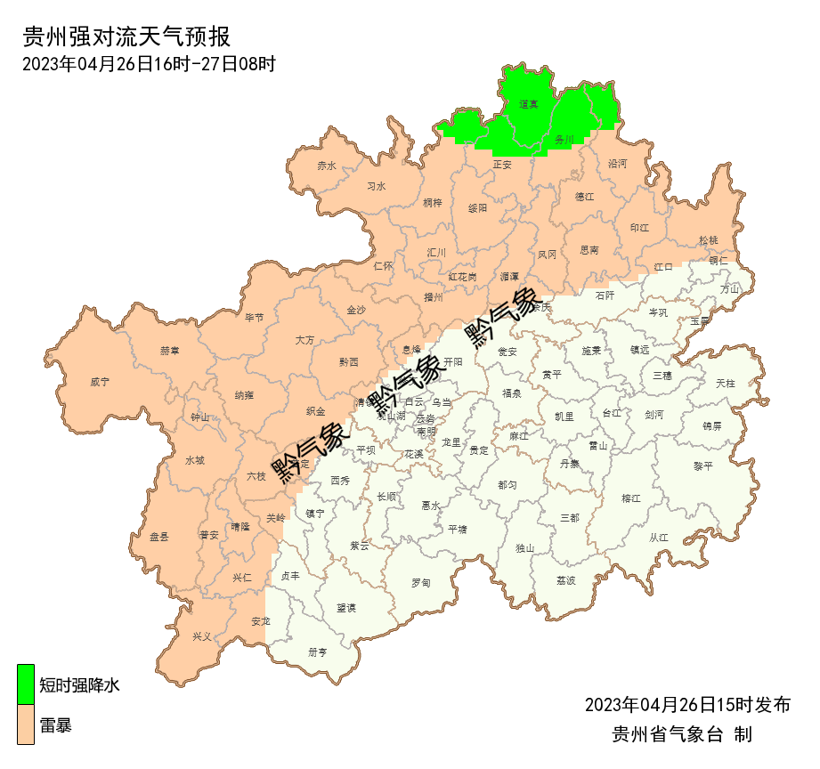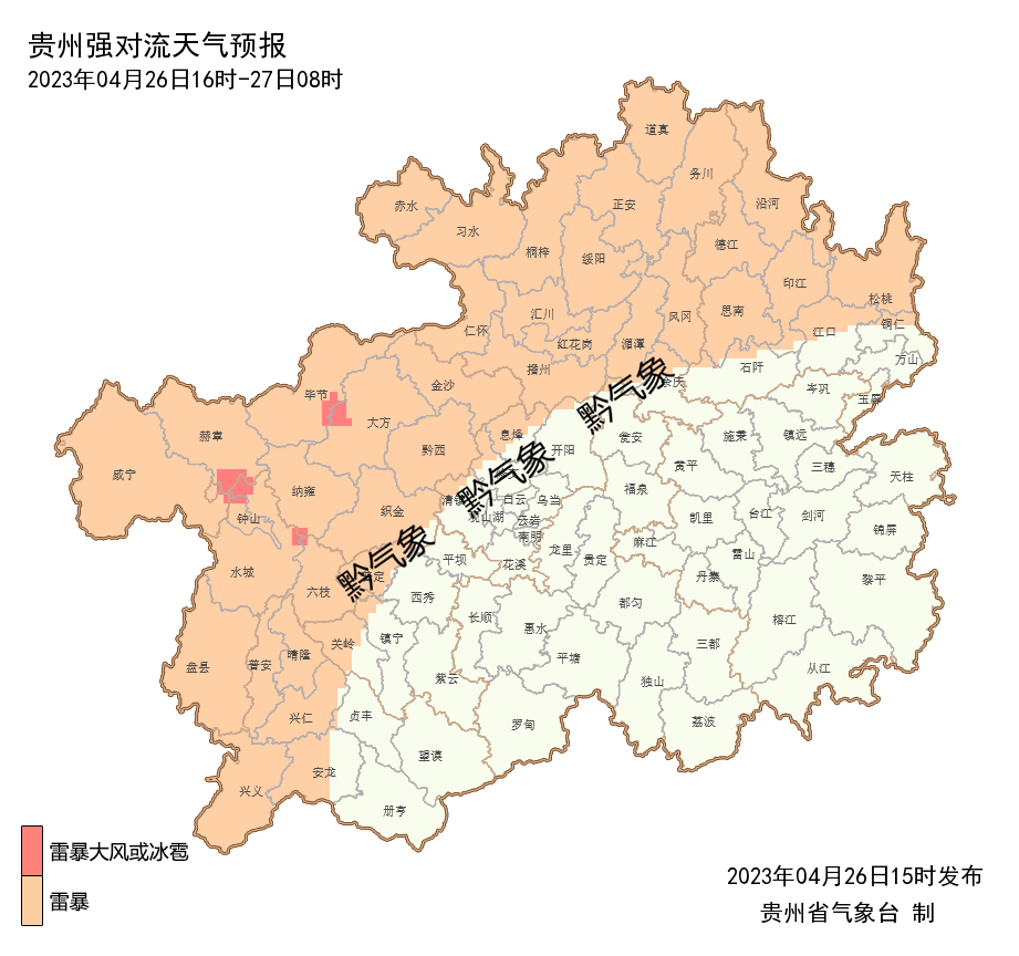 今天傍晚到夜间,省的西部及北部地区多云转阴天有阵雨或雷雨,毕节市、六盘水市局地伴有冰雹、雷暴大风及短时强降水等强对流天气,遵义市北部、铜仁市北部局地有中到大雨,其余地区多云,明天白天,省的西部地区多云,其余地区阴天间多云有分散阵雨;