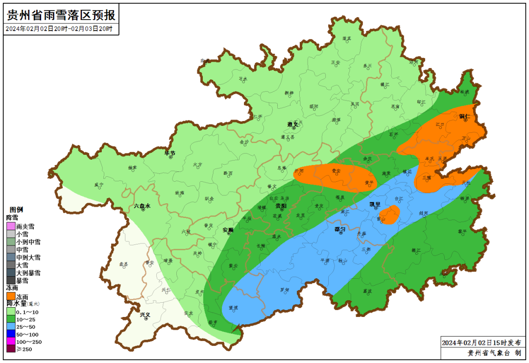 2日夜间到3日白天,省的西南部晴到多云,其余大部地区阴天有小到中雨,铜仁市和黔东南州局部有冻雨或雨夹雪,东南部有大雨,午后到夜间,省的西南部局地有雷暴大风、小冰雹等强对流天气,省的中部以西以南地区气温下降4至8℃。