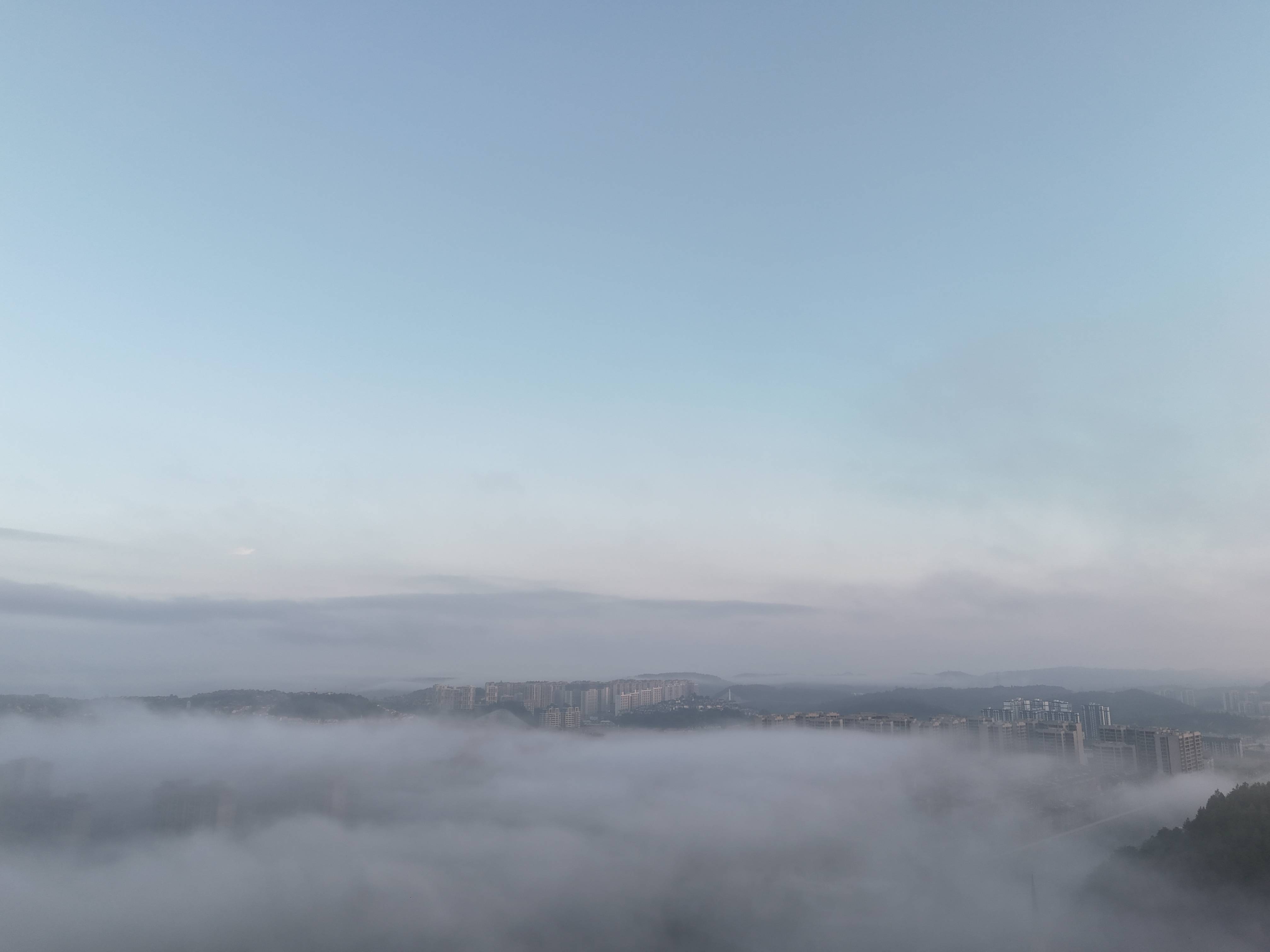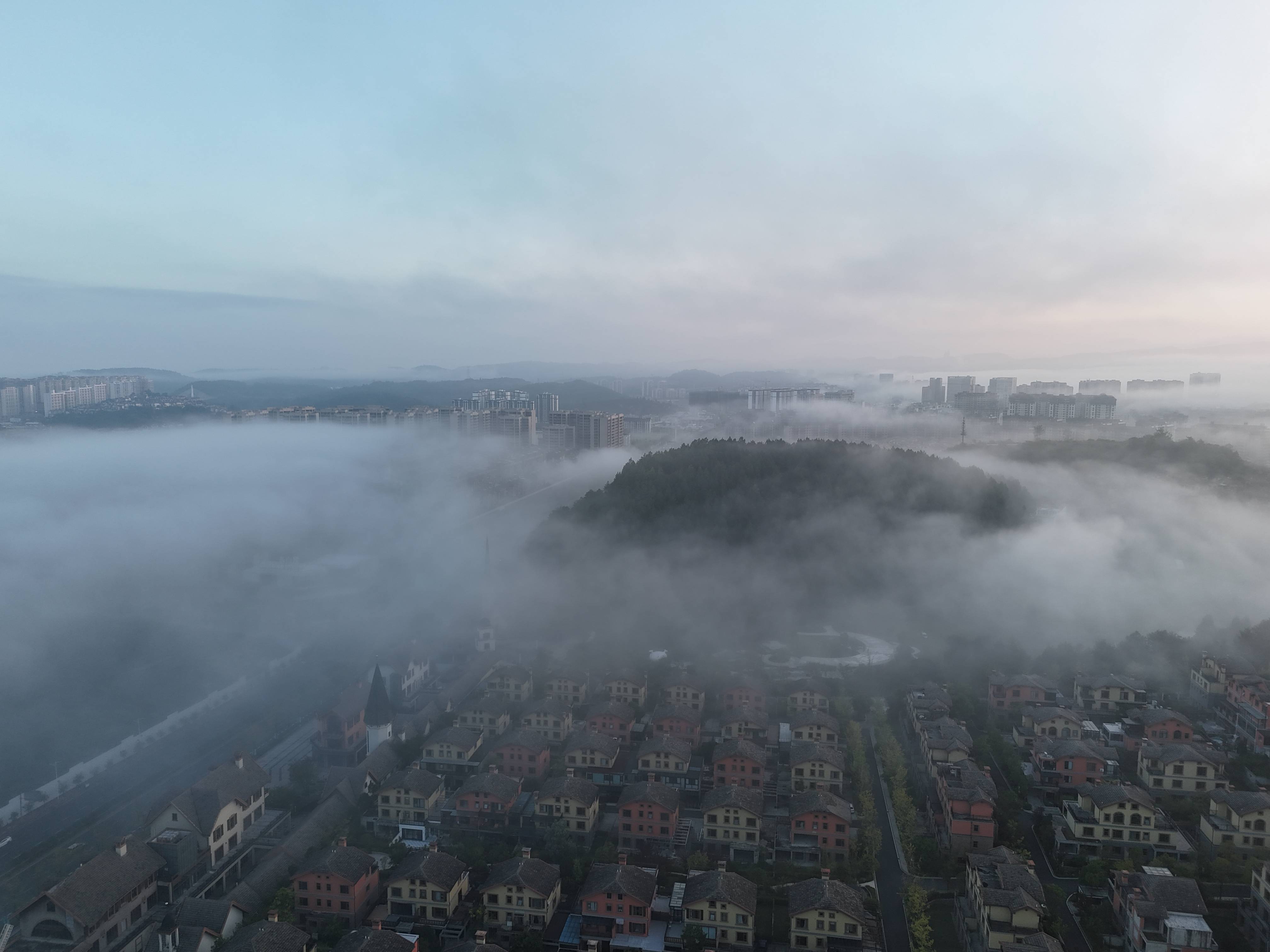 9月10日清晨6时许,贵州省贵阳市多地出现辐射雾,当地气象台发布大雾黄色预警信号。在贵阳市南部与黔南州交界处一地受地形和水汽影响云雾缭绕,建筑物若隐若现、宛罗仙境。