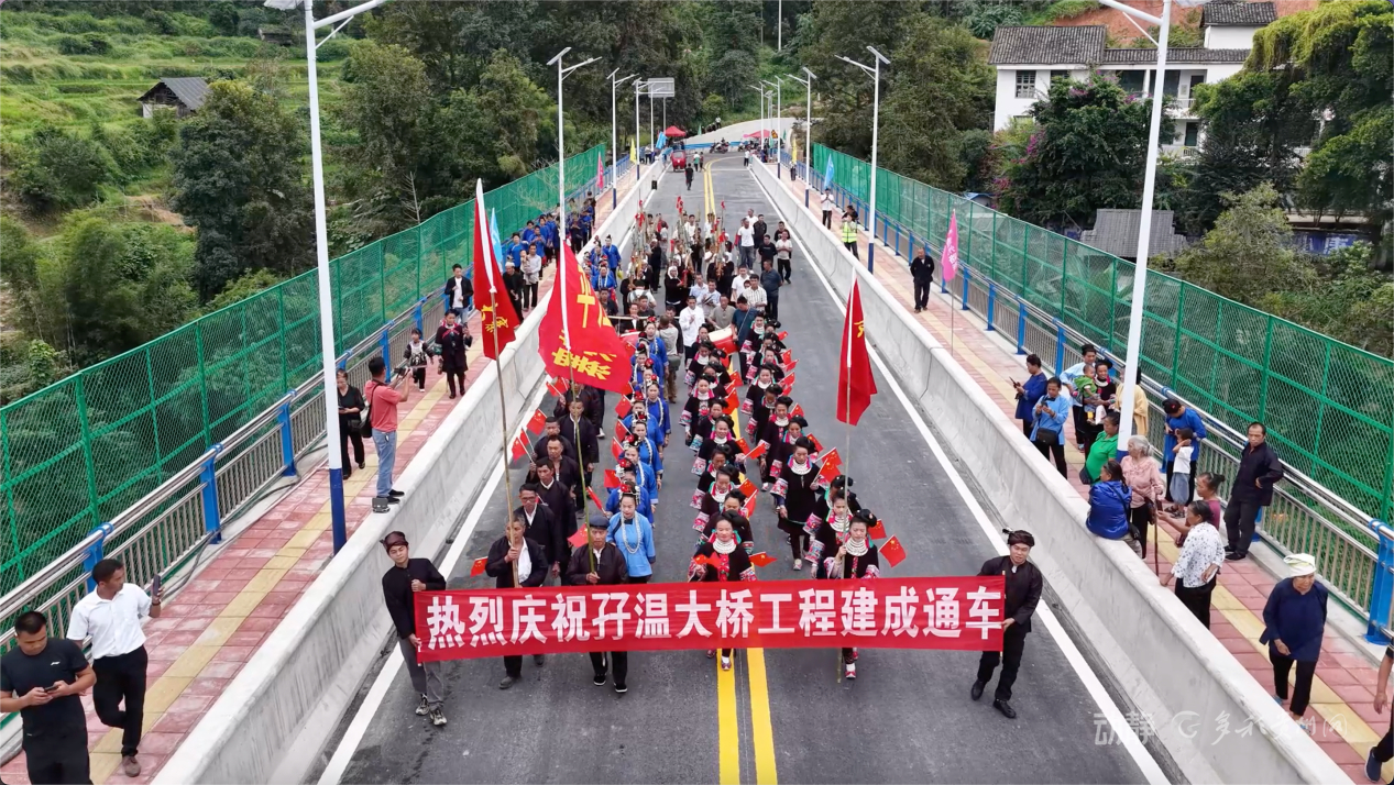 在通车仪式现场,来自孖温村、岑送村、平茶村、良文村等周边村寨的老百姓自发来到现场庆祝大桥通车。大家身着民族服饰,载歌载舞,脸上洋溢着喜悦的笑容,一同见证这一历史时刻的到来。