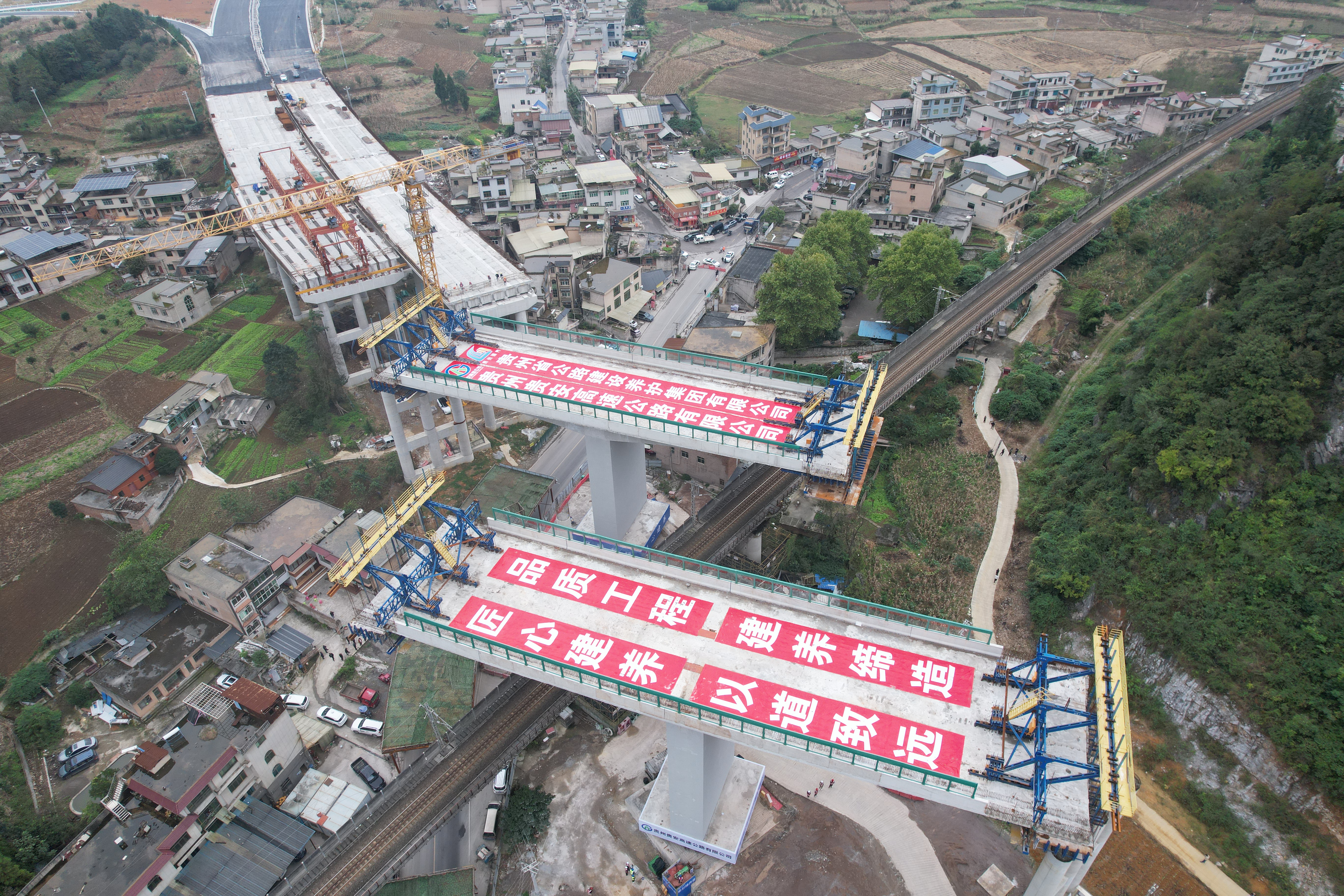 站街1号大桥全长524米,转体角度达105度,单幅转体重量约7100吨,此次实现一次性同步转体到位,相当于在空中完成一次“毫米级精准转身”。该桥施工环境复杂,上跨湖雍铁路老王冲大桥与S106省道,其新建高速基桩与既有铁路基桩最小水平距离仅10.93米。自开工以来,贵安高速公司组织项目部从大型设备进场、施工方案落地,到现场施工管理、人员防护检查等各环节全程执行高标准、严要求,积极打造涉铁施工标准化典范。
