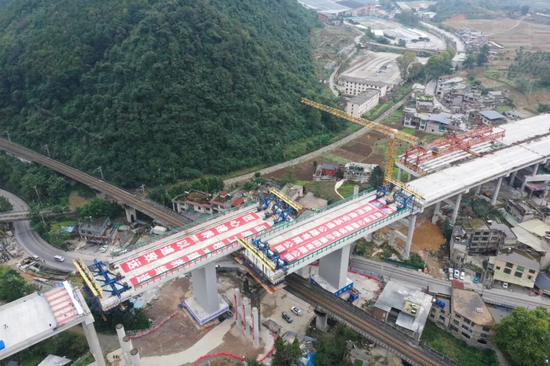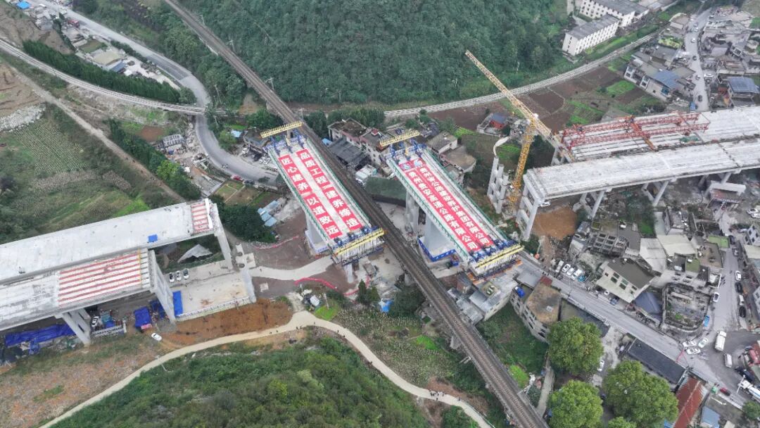 该桥施工环境堪称“复杂之最”:上跨既有湖雍铁路老王冲大桥及省道S106线,同时穿行于站街镇莲花村居民集中区,新建高速基桩与既有铁路基桩最小水平距离仅10.93米,施工安全风险高、多方协调难度大。为攻克这一难题,项目部提前编制多份专项施工方案与安全预案,反复优化施工工艺;在涉铁施工协调中,团队与成都局集团公司等部门紧密对接,半年内多次往返于成都与贵阳推进手续办理,先后于2024年6月3日、9月13日顺利取得施工设计图及涉铁施工组织设计批复,并于2024年11月1日正式开工建设。