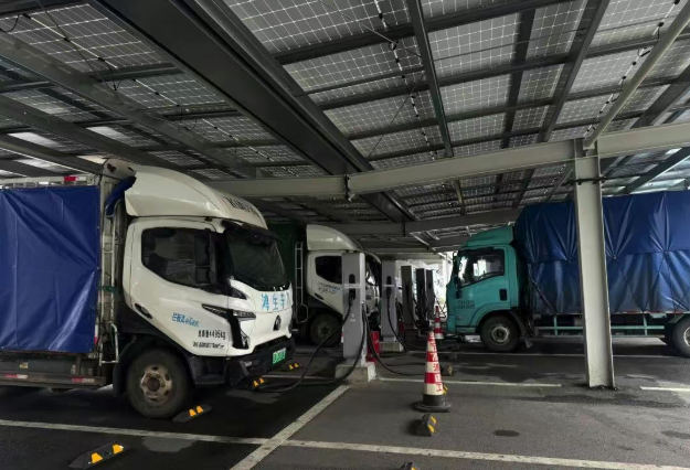 采访时,几辆新能源货车正在服务区充电,充电桩屏幕上跳动的数字,实时记录着每一度绿电的流动。