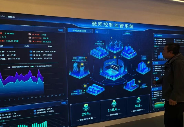 今年1月,该服务区构建了集数据采集、监测分析、智能调度于一体的智慧能碳管控平台。平台实时采集2079块光伏组件、储能设备、充电桩等能源设施的运行数据,运用大数据算法进行用能分析和预测,实现“发电-储能-用电”的精准匹配和动态优化,确保关键设施持续供电不低于8小时,极大提升了供电韧性与运行效率。