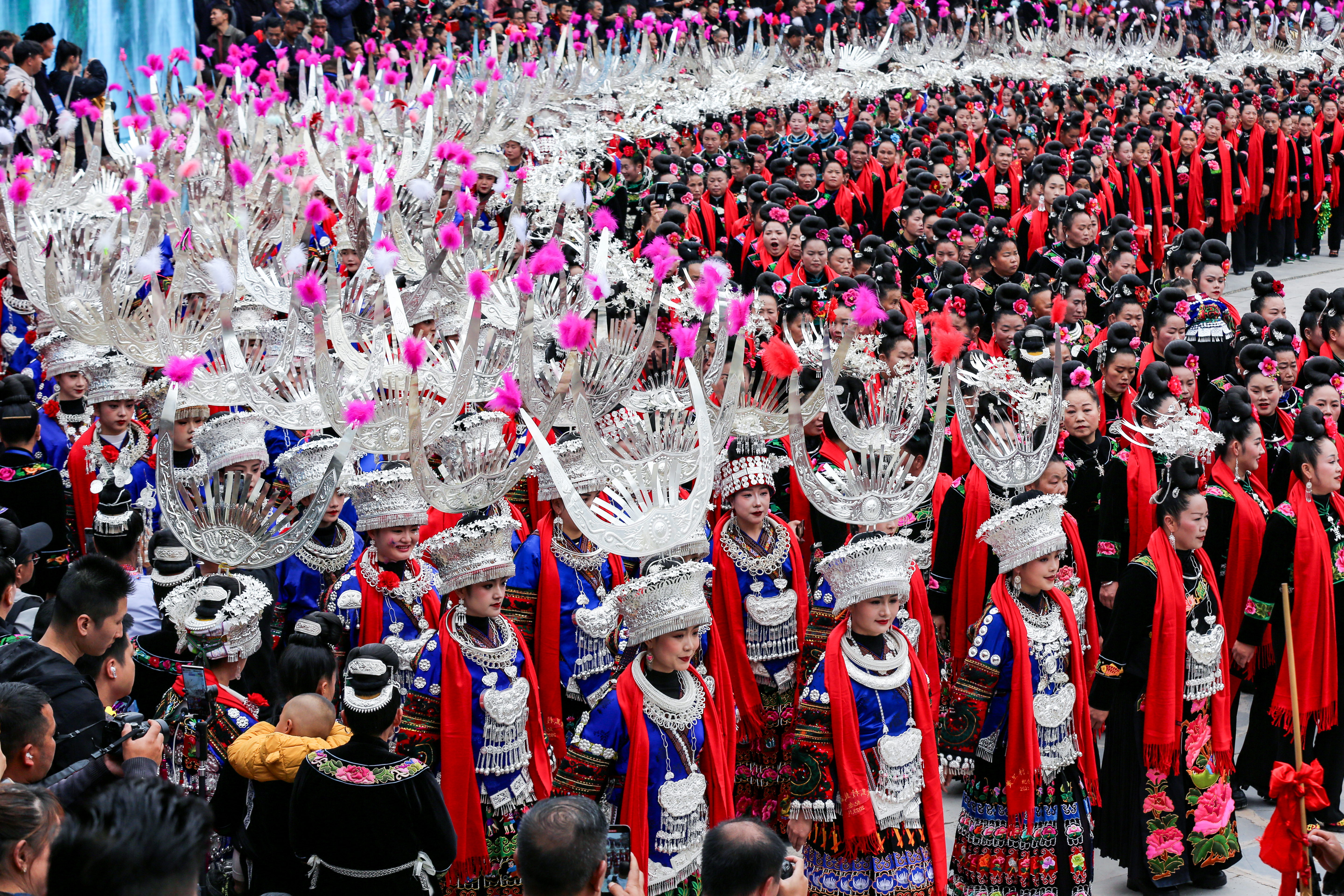 苗年不仅是黔东南州雷山县地区最为隆重的节日,还是国家级非物质文化遗产。苗年节当天最震撼的场面莫过于万人盛装巡游。来自各个村寨的苗族群众身着节日盛装,银饰叮当作响,绣衣五彩斑斓,组成浩浩荡荡的巡游队伍。15项国家级非遗现场展示,让人目不暇接。