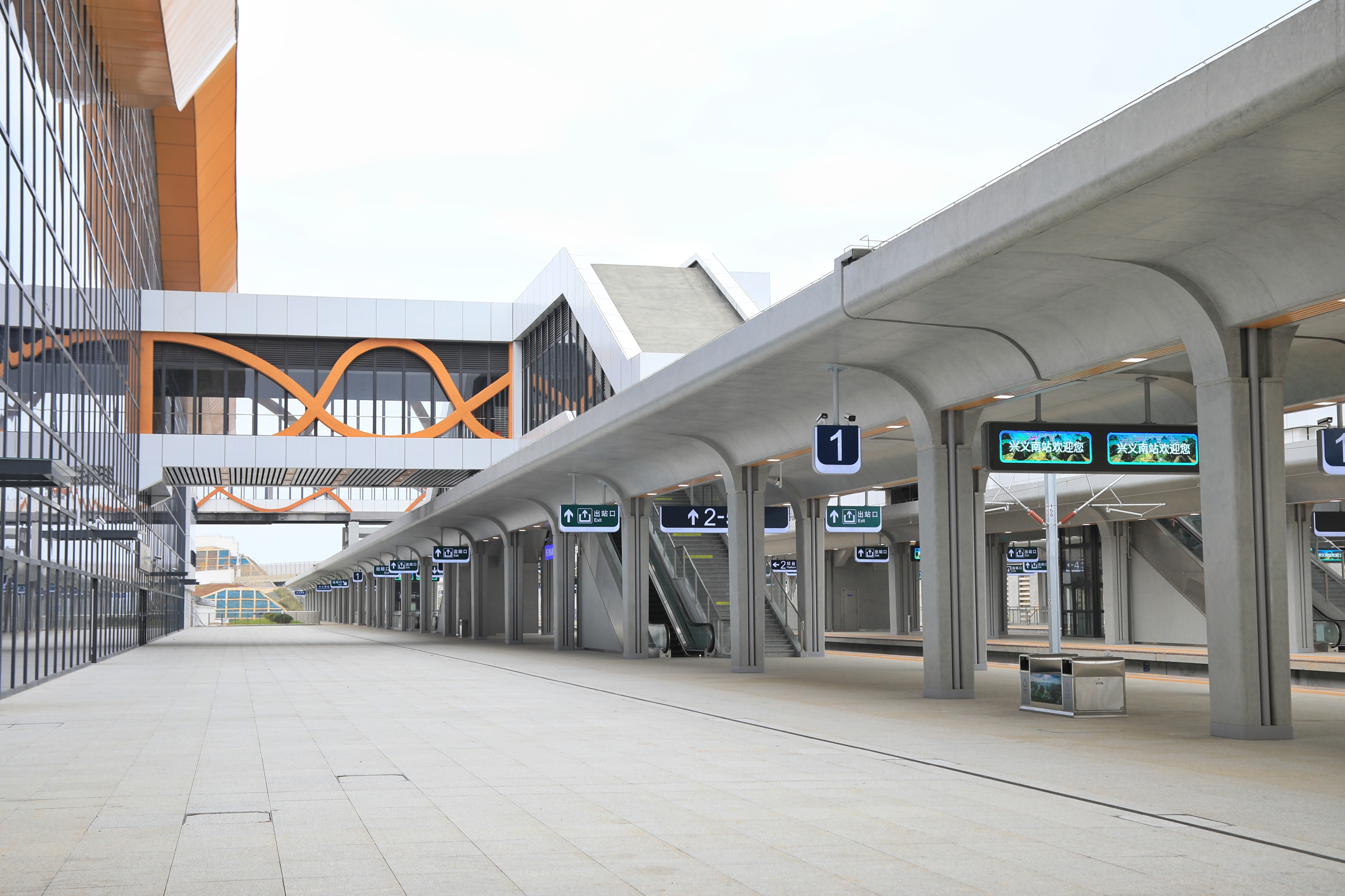 兴义南站:位于贵州省黔西南布依族苗族自治州兴义市,站房建筑面积近20000平方米,站场规模为3台5线,远期设计为4台7线,同时预留2条到发线,配备1座旅客地道、1座旅客人行天桥和1座物流地道,为线侧平式站型,分上下两层。站房设计以“万峰林”自然景观为灵感,融入“连绵逶迤 万峰成林”的地域文化符号,通过薄腹钢管梁式金属屋面与清水混凝土工艺结合,既体现现代钢结构美学,又彰显黔西南喀斯特峰林特色。