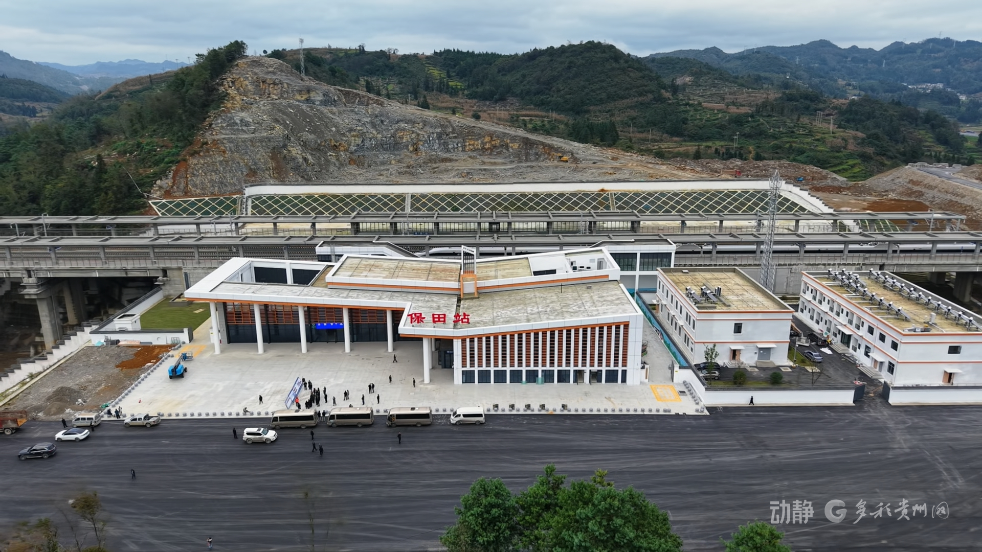 保田站:坐落于贵州省盘州市保田镇,是盘兴城际铁路唯一中间站,站房建筑面积近3000平方米,站场规模为2台4线(含正线2条),站房设计灵感源自山地的自然意象,以“曲折山路、山间驿站”立意进行设计,整体屋面采用层叠转折的形态,犹如一条蜿蜒崎岖的山路,顺势展开,与周边环境融为一体。同时,车站站台采用清水混凝土雨棚的标准化施工工艺,确保了雨棚线条流畅、色泽统一,成为站房外观的重要亮点。