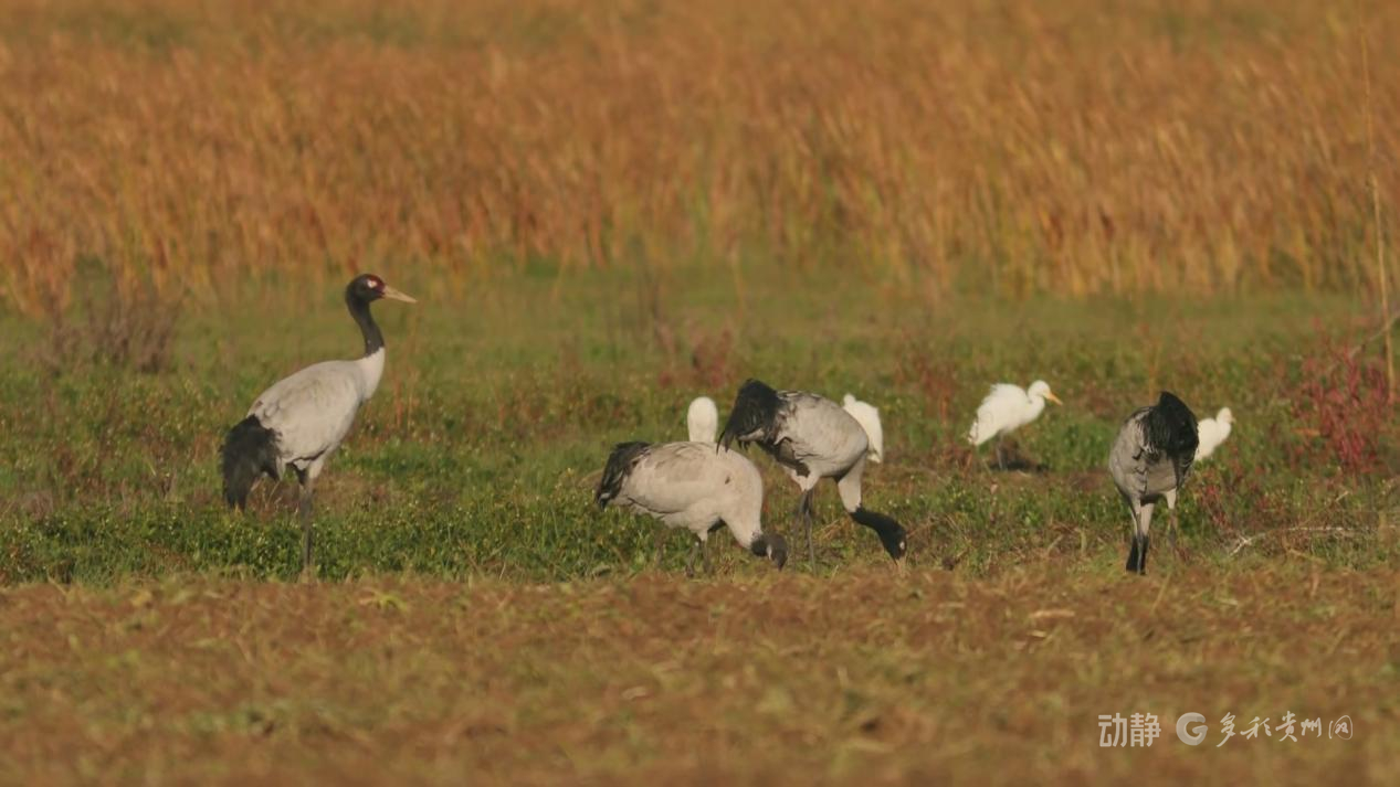 在贵州草海国家级自然保护区,4只越冬黑颈鹤历经长途跋涉,从四川若尔盖松潘草地一路飞行约800公里后,如约抵达草海,开启今年的越冬生活。