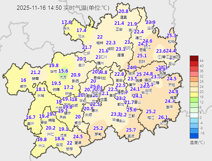 今天(11月16日),又是一个暖阳相伴的日子,全省大部分地区气温达到近期最高点,罗甸、三都、从江、榕江等地14时50分气温超过25℃!