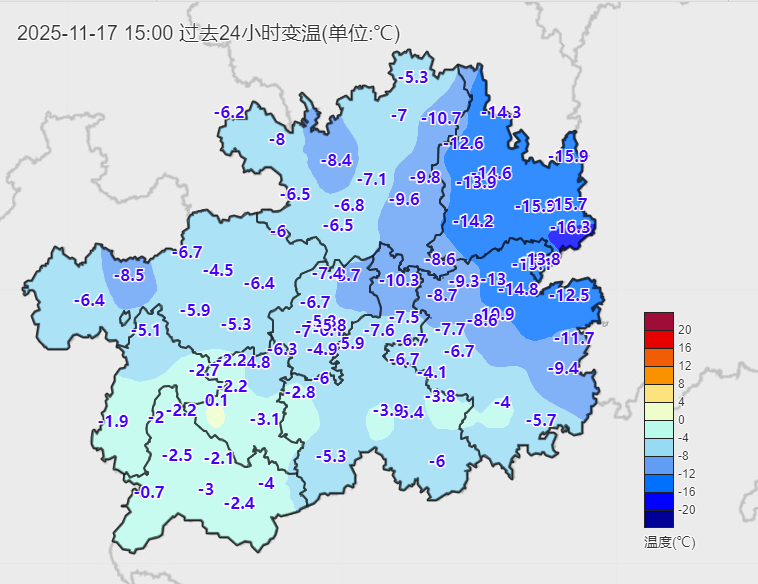 其中铜仁万山以16.3℃的降幅,