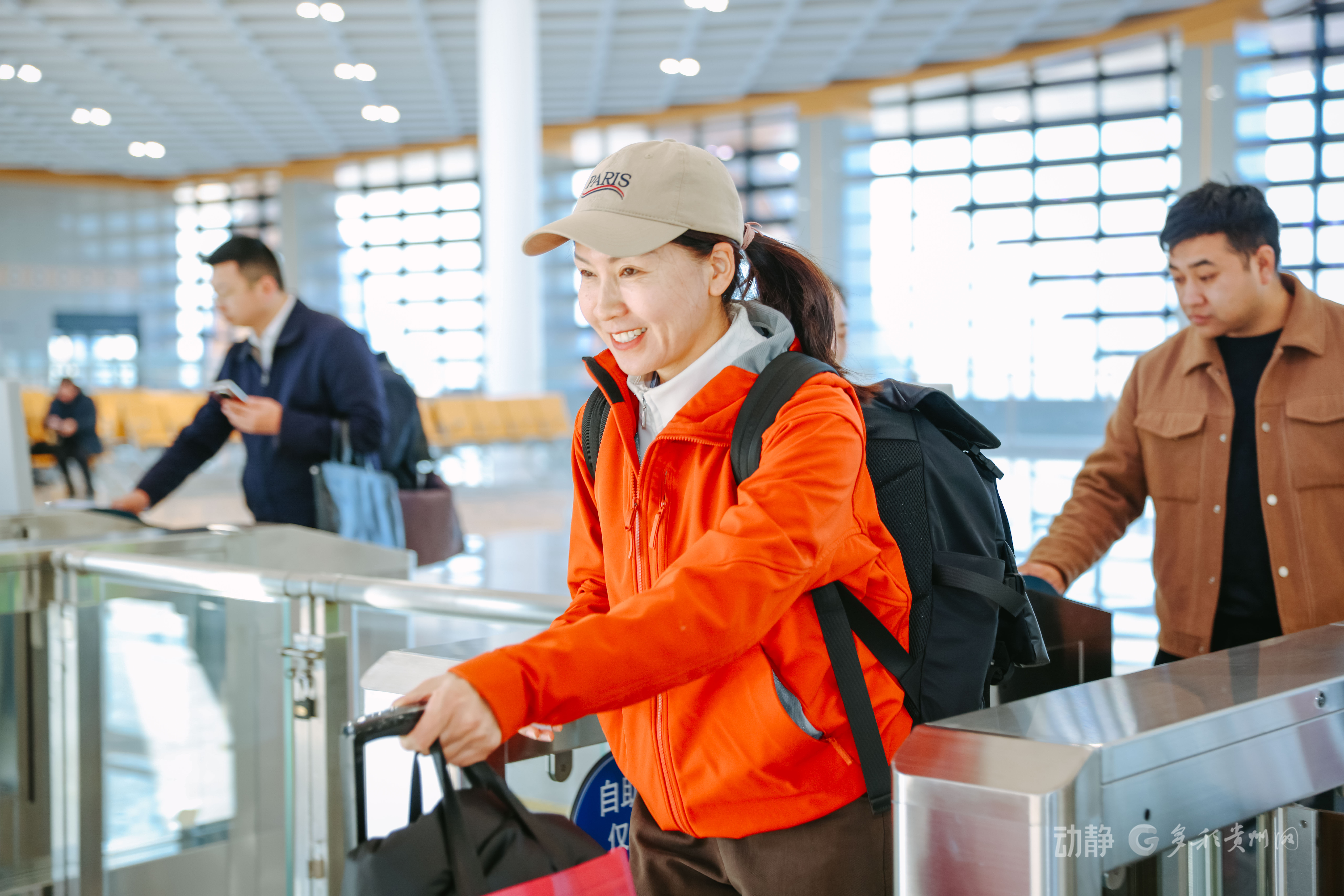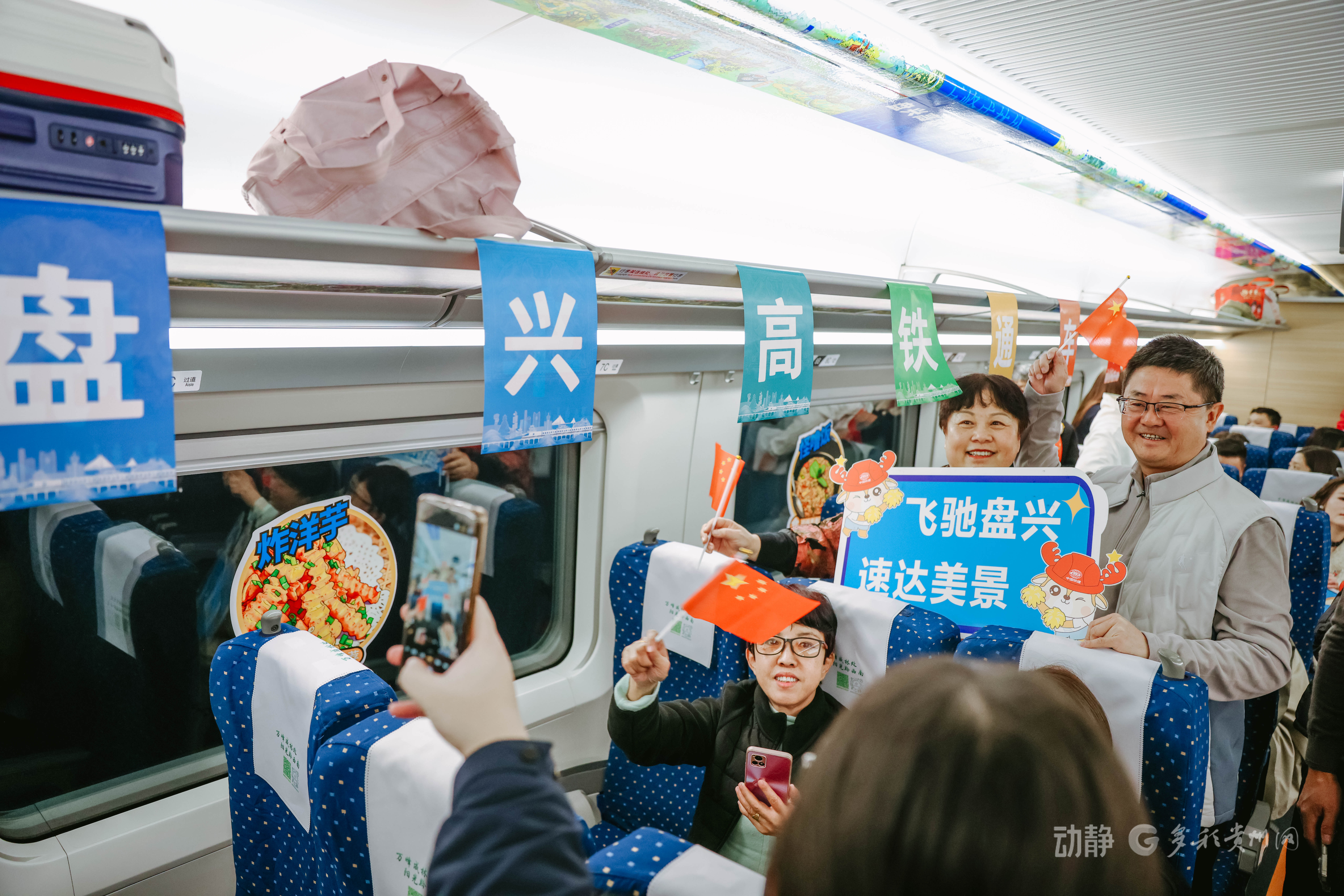 盘兴高铁发车前,旅客在列车外拍照打卡