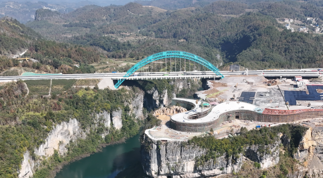 该桥采用非对称中承式钢管拱桥设计,主跨达176米,桥面宽度达40.8米,是目前国内在建高速公路中最宽的不对称钢管混凝土拱桥。全桥由18个拱肋节段拼装组成,最大吊重达104.2吨,7道横撑构建空间受力体系。施工中通过“荡移+载重横移”“重力式+岩锚复合式锚碇”“北斗卫星系统”等手段,实现毫米级误差控制,确保拱肋线形精准合龙。