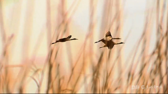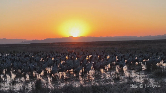 在温家屯夜栖地,薄雾缭绕间,成群结队的黑颈鹤舒展羽翼、翩跹起舞,修长的身影与澄澈的湖水互交互织,在静谧中划出流动的诗意。