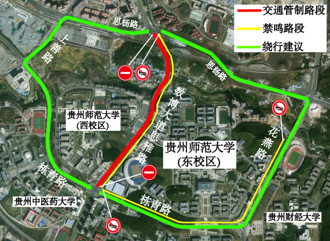 贵州省2026年普通高等学校艺术类考试将于2025年12月9日至12月14日在贵州师范大学东区进行。为给考生营造良好的考试环境,因期间考场周围环境要求,根据《中华人民共和国道路交通安全法》第39条之规定,决定对贵安新区大学城数博大道思雅路部分路段临时交通管制,现通告如下: