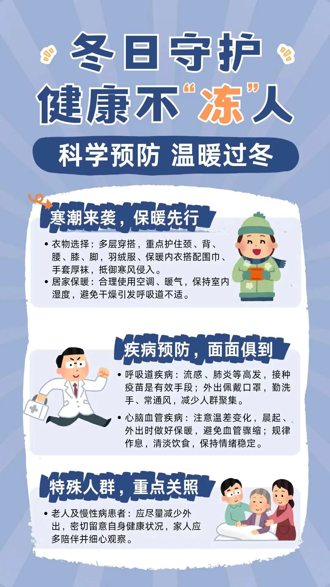 2. 公众健康:重点防范心脑血管风险,气温骤降时,容易诱发心脑血管疾病,老人、小孩和慢性病患者尤其要注意。