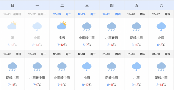 根据气象部门发布的天气预报显示,12月31日(周三)至1月1日(周四)贵阳市连续降雨,气温在7-11℃之间,雨天路面湿滑,车辆减速慢行,预计易出现交通拥堵。