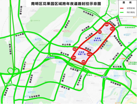 跨年夜活动期间,需要经过观山东路、长岭北路、林城东路、金朱东路的穿过性交通,请提前出发或者尽量通过替代道路绕行,以免耽误行程。