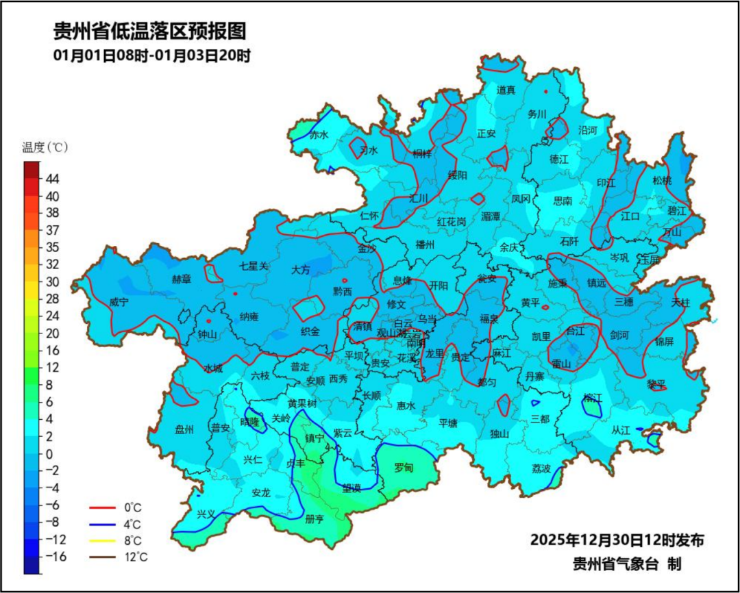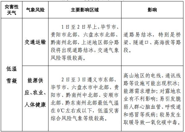 预计2026年1月2日至3日早上,遵义市东部、毕节市、六盘水市中北部、贵阳市、黔南州中北部、安顺市北部、黔东南州北部最低气温在0℃左右或以下,省的西北部部分路段及桥梁、涵洞口等地将出现道路结冰,交通及农业气象风险等级较高;气温下降,一氧化碳中毒气象条件风险等级较高。