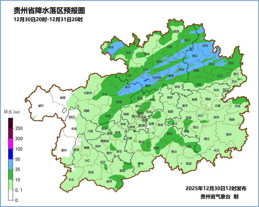 图1 2025年12月30日20时至31日20时贵州省降水落区预报图