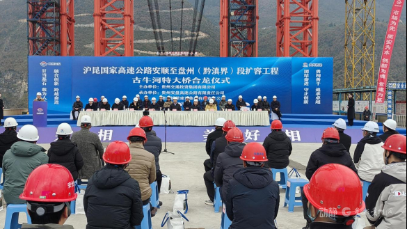 今天(1月5日)下午,贵州交投集团所属桥梁集团承建的安盘高速古牛河特大桥最后一节钢拱精准吊装到位,大桥顺利合龙。