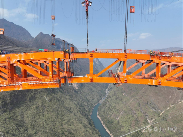 据了解,古牛河特大桥2025年6月14日启动首节段吊装。针对主拱圈最大吊装节段近290吨的超级重量,建设团队自主研发智慧缆吊系统,首创吊装轨迹精准控制技术,为节段吊装装上了“智能导航”,确保节段沿着最优路径平稳、精准抵达预定位置,有效保证了整个吊装过程安全可控。