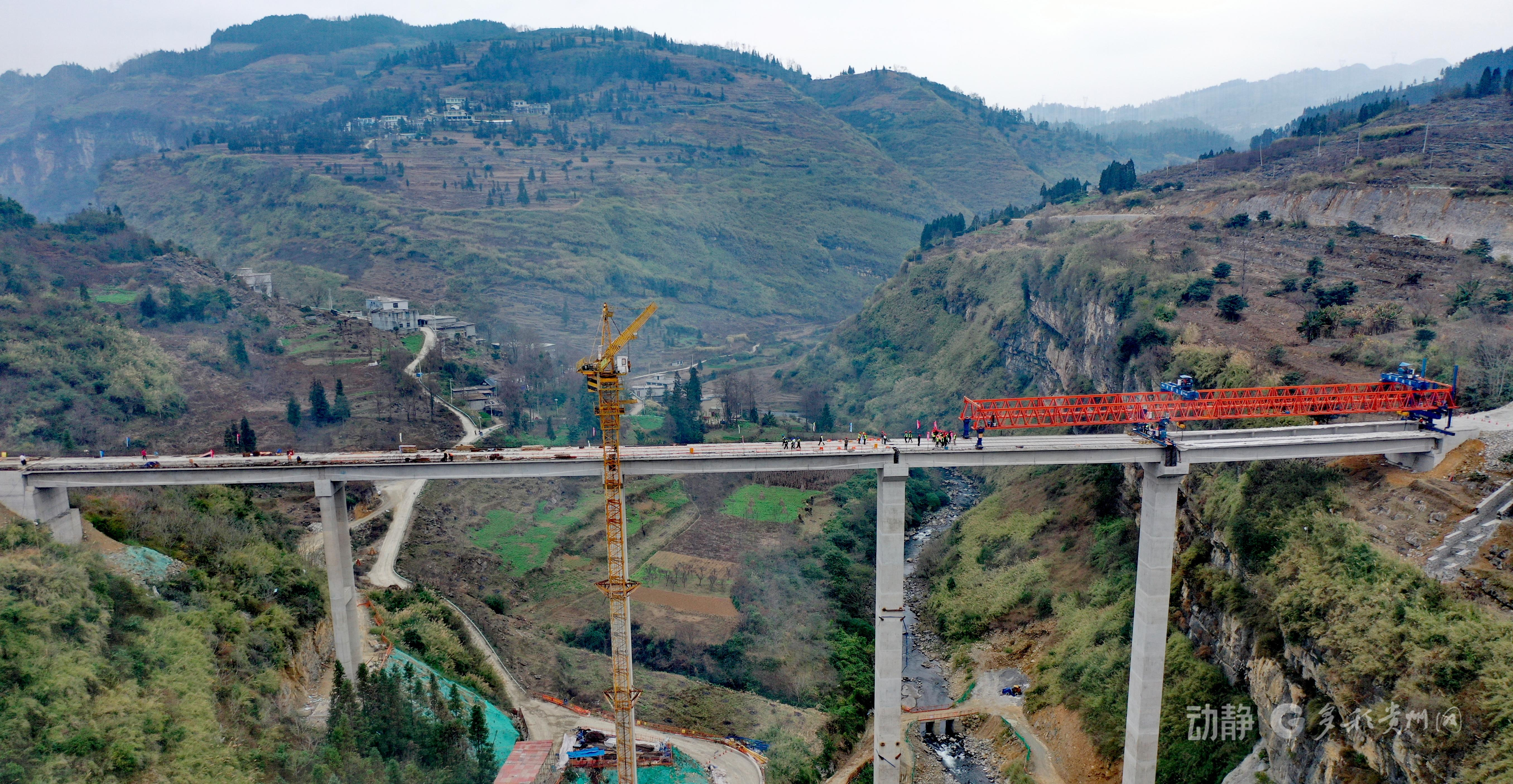 黄家桥大桥位于六枝特区新场乡至牛场乡连接道路,桥梁总长214米,最大墩高71米。桥梁地处喀斯特地貌区域,沿线沟壑交错,部分桥段需跨越乡村道路,对T梁架设精准度要求极高。贵安高速公司组织项目部通过推行“一桥一策”精细化管理,以智能预制和精准架设等方式,高效完成了黄家桥大桥T梁架设任务。