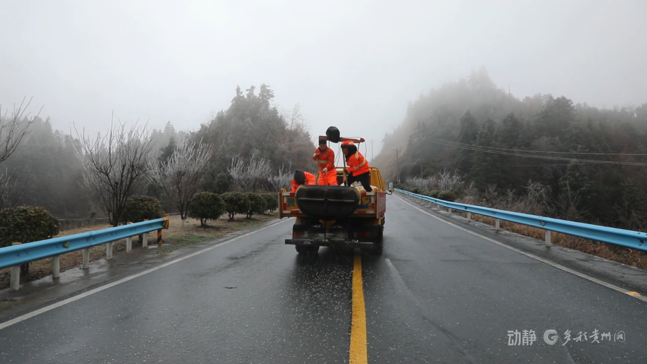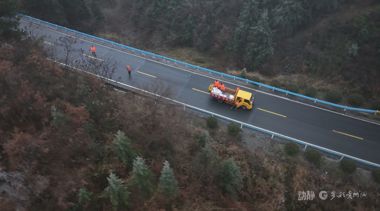 黔南布依族苗族自治州三都水族自治县及时对凝冻路段开展除冰作业;黔东南苗族侗族自治州天柱、从江、施秉等地加强重点路段巡查监测,确保风险早发现、早处置;瓮安县向司乘人员发放“暖心包”,包含方便面、面包、矿泉水等物资。